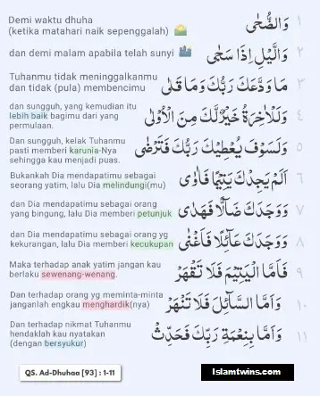 Surat Ad-Dhuha, dengan pesan-pesan penghiburan, optimisme, dan harapan yang terkandung di dalamnya, menjadi sumber kekuatan spiritual bagi setiap muslim.