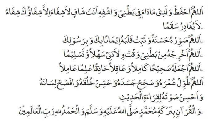 Allahummahfazh waladii maadaama fii bathnika wasyfihi anta syaafil laa syifaa illa syofaauka syifaa allaa yughaadiru saqama. Allahumma showwirhu hasanata watabbit qalbahu iimaanambika wabi Rasuulika. Allahumma akhrijhu mimbathnii waqta wilaadatii sahlaw watasliimaa. Allahummaj’alhu shohiihan kaamilaw wa’aaqilan hadziqon ‘aliman ‘aamilaa. Allahumma thowwil ‘umrohu washohhih jasadahu Wahasan khuluqohu wafshoh lisaanahu wa ahsin shoutahu liqirooatil hadiitsi, Walquraani bibarakati Muhammadin shollallahu 'alaihi wa sallam. Walhamdulillahi Robbil ‘aalamiin.