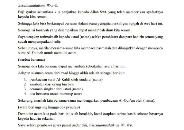 Selanjutnya, akan saya bacakan susunan acara pengajian rutin kita pada pagi/siang/sore/malam hari ini dari awal sampai akhir, yaitu: