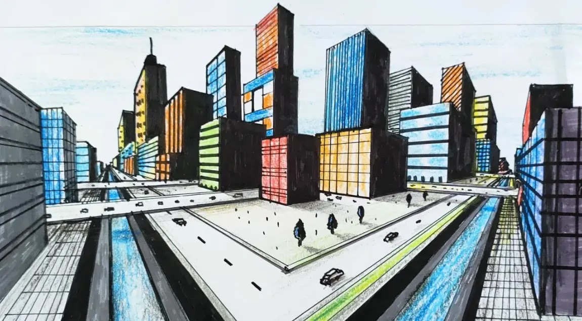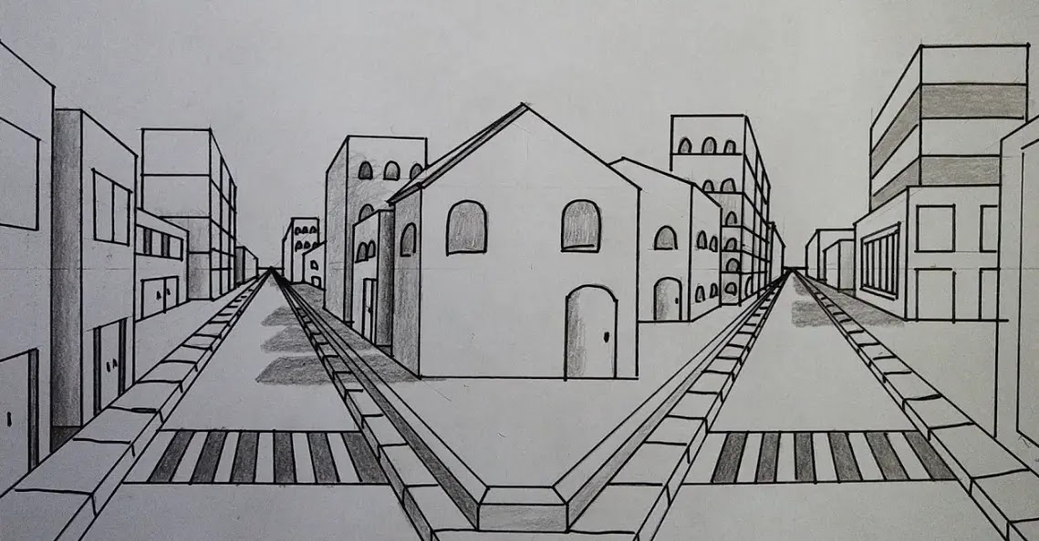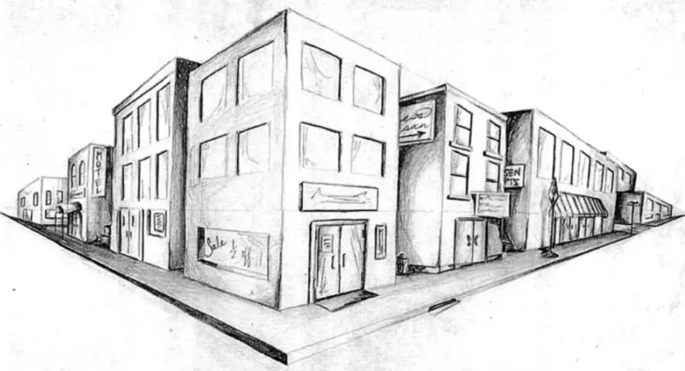 Penggunaan gambar perspektif 2 titik hilang juga dapat diterapkan pada menggambar pemandangan kota yang rumit. Berikut adalah contohnya: