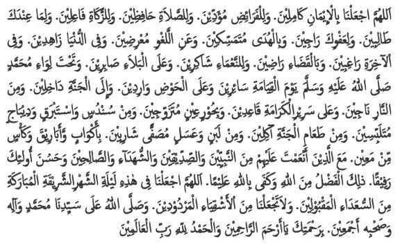اَللهُمَّ اجْعَلْنَا بِالْإِيْمَانِ كَامِلِيْنَ. وَلِلْفَرَائِضِ مُؤَدِّيْنَ. وَلِلصَّلاَةِ حَافِظِيْنَ. وَلِلزَّكَاةِ فَاعِلِيْنَ. وَلِمَا عِنْدَكَ طَالِبِيْنَ. وَلِعَفْوِكَ رَاجِيْنَ. وَبِالْهُدَى مُتَمَسِّكِيْنَ. وَعَنِ الَّلغْوِ مُعْرِضِيْنَ. وَفِى الدُّنْيَا زَاهِدِيْنَ. وَفِى اْلآخِرَةِ رَاغِبِيْنَ. وَبَالْقَضَاءِ رَاضِيْنَ. وَلِلنَّعْمَاءِ شَاكِرِيْنَ. وَعَلَى الْبَلاَءِ صَابِرِيْنَ. وَتَحْتَ لِوَاءِ مُحَمَّدٍ صَلَّى اللهُ عَلَيْهِ وَسَلَّمَ يَوْمَ الْقِيَامَةِ سَائِرِيْنَ وَعَلَى الْحَوْضِ وَارِدِيْنَ. وَإِلَى الْجَنَّةِ دَاخِلِيْنَ. وَمِنَ النَّارِ نَاجِيْنَ. وَعَلى سَرِيْرِالْكَرَامَةِ قَاعِدِيْنَ. وَبِحُوْرٍعِيْنٍ مُتَزَوِّجِيْنَ. وَمِنْ سُنْدُسٍ وَاِسْتَبْرَقٍ وَدِيْبَاجٍ مُتَلَبِّسِيْنَ. وَمِنْ طَعَامِ الْجَنَّةِ آكِلِيْنَ. وَمِنْ لَبَنٍ وَعَسَلٍ مُصَفًّى شَارِبِيْنَ. بِأَكْوَابٍ وَّأَبَارِيْقَ وَكَأْسٍ مِّنْ مَعِيْن. مَعَ الَّذِيْنَ أَنْعَمْتَ عَلَيْهِمْ مِنَ النَّبِيِّيْنَ وَالصِّدِّيْقِيْنَ وَالشُّهَدَآءِ وَالصَّالِحِيْنَ وَحَسُنَ أُولئِكَ رَفِيْقًا. ذلِكَ الْفَضْلُ مِنَ اللهِ وَكَفَى بِاللهِ عَلِيْمًا. اَللهُمَّ اجْعَلْنَا فِى هذِهِ اللَّيْلَةِ الشَّهْرِالشَّرِيْفَةِ الْمُبَارَكَةِ مِنَ السُّعَدَاءِ الْمَقْبُوْلِيْنَ. وَلاَتَجْعَلْنَا مِنَ اْلأَشْقِيَاءِ الْمَرْدُوْدِيْنَ. وَصَلَّى اللهُ عَلَى سَيِّدِنَا مُحَمَّدٍ وَآلِه وَصَحْبِه أَجْمَعِيْنَ. بِرَحْمَتِكَ يَاأَرْحَمَ الرَّاحِمِيْنَ وَالْحَمْدُ لِلّهِ رَبِّ الْعَالَمِيْنَ
